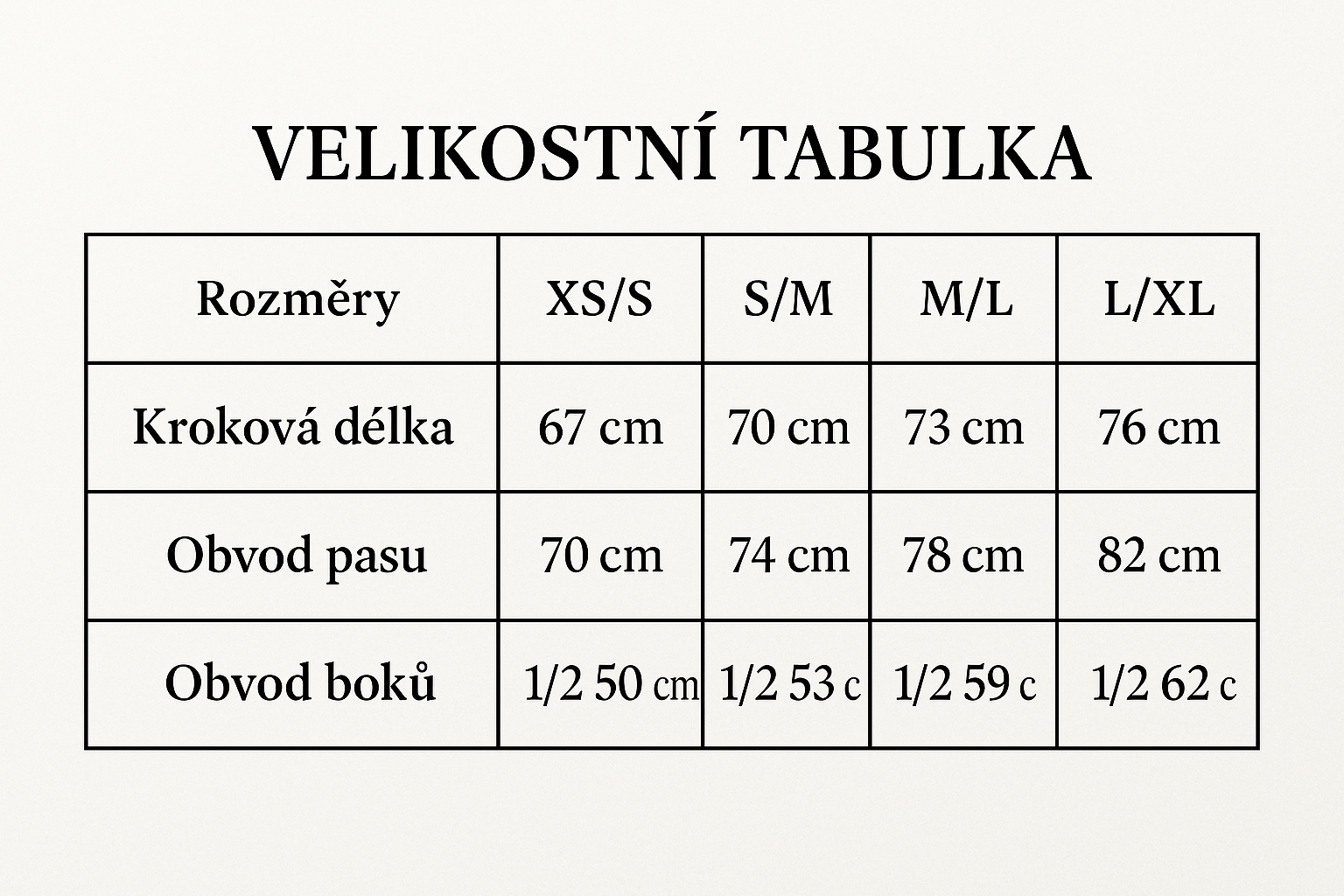 Kalhoty jsou navrženy a prodávány ve sdílených dvojvelikostech ( XS/S - XL/XXL ).