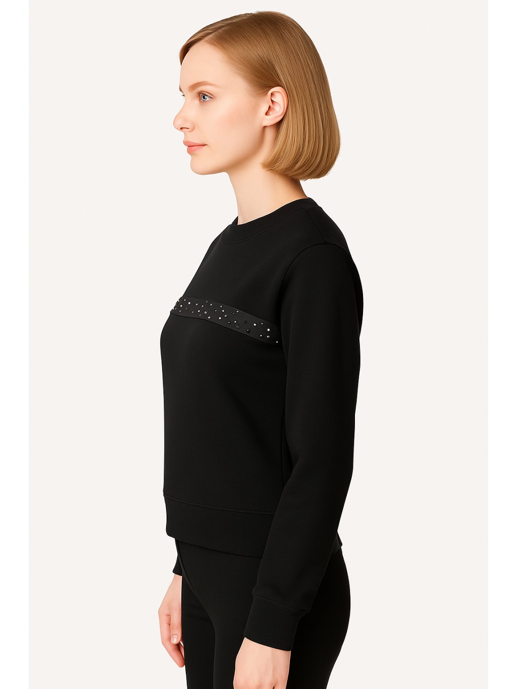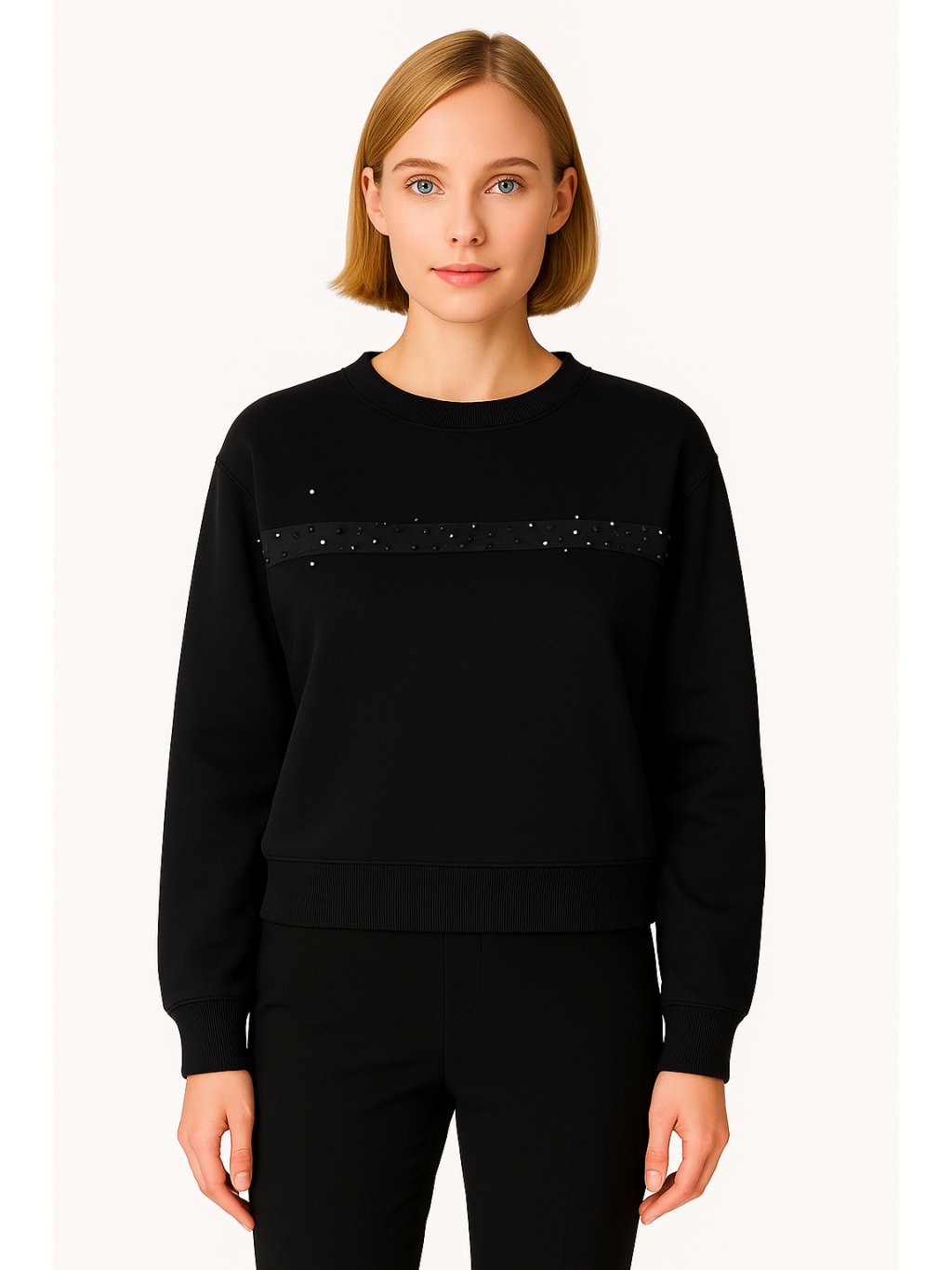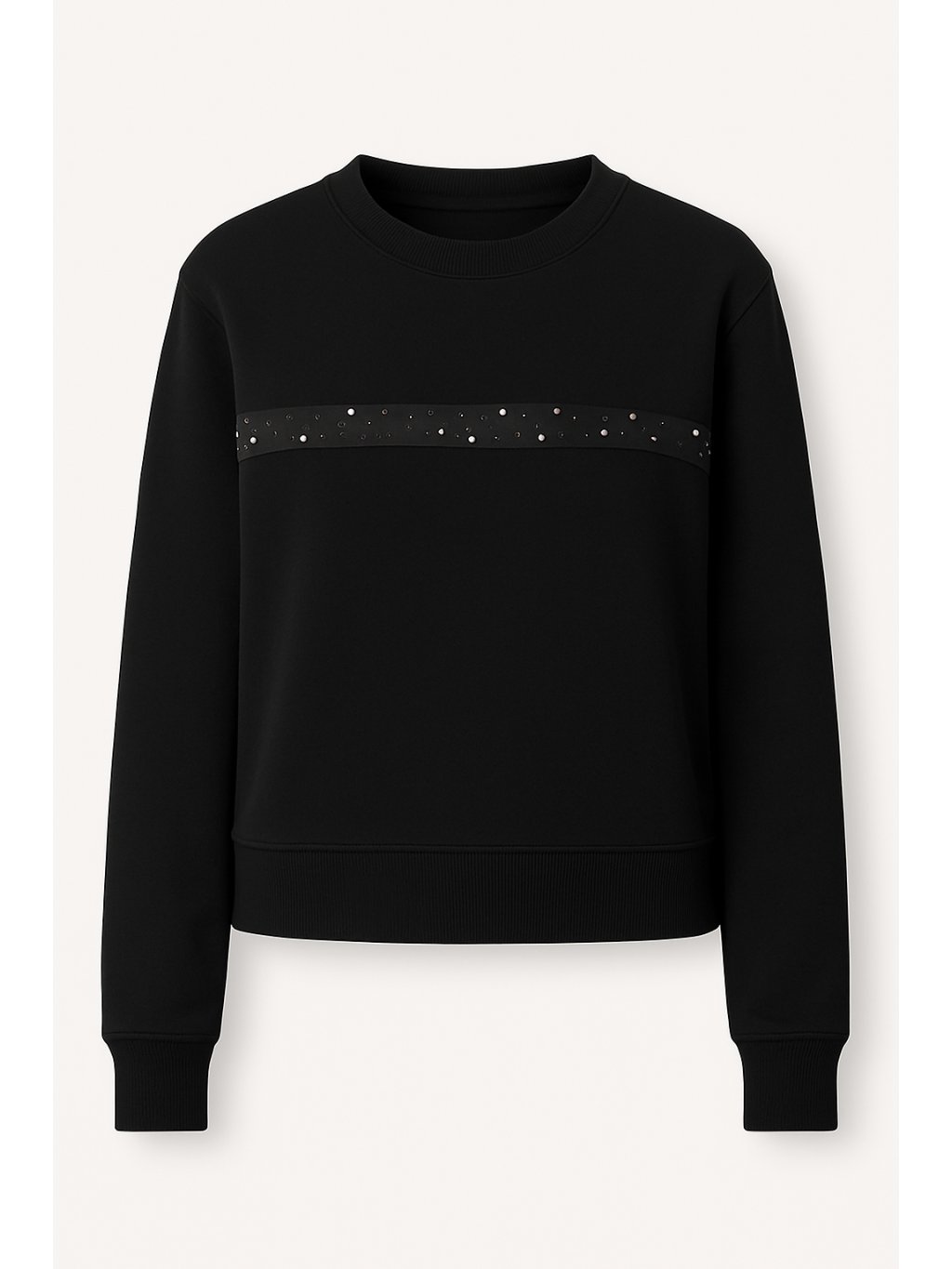 Stylová mikina Luna s ručně aplikovanými kamínky Preciosa vyniká svou jednoduchostí a luxusními detaily. Černý základ doplňuje dekorativní pruh s třpytivými kamínky, které dodávají modelu jemný lesk a ženský nádech.