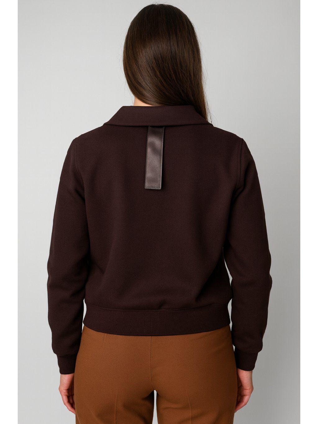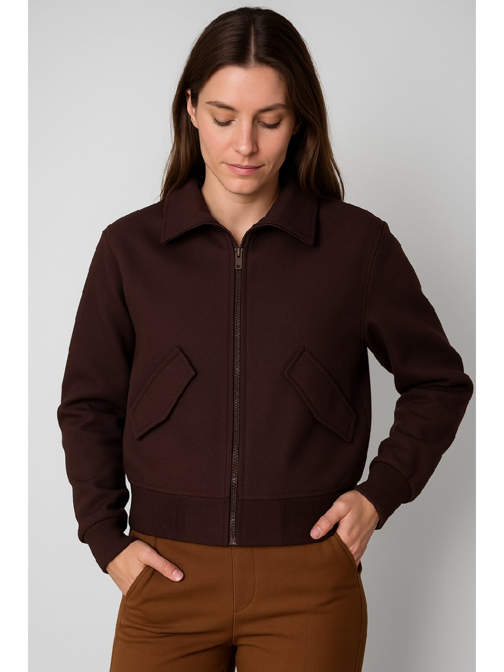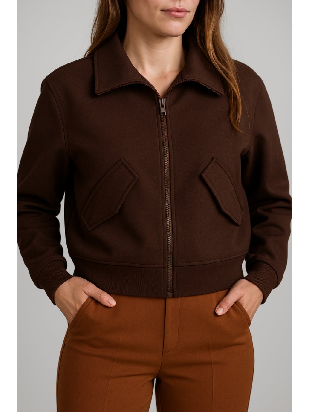 Dodej svému outfitu sebevědomý a moderní vzhled s touto krátkou hnědou bundou se zipem. Její minimalistický design s výrazným límcem, dvěma klopovými kapsami a pevným žebrovaným lemem vytváří elegantní siluetu, která krásně zvýrazní pas.