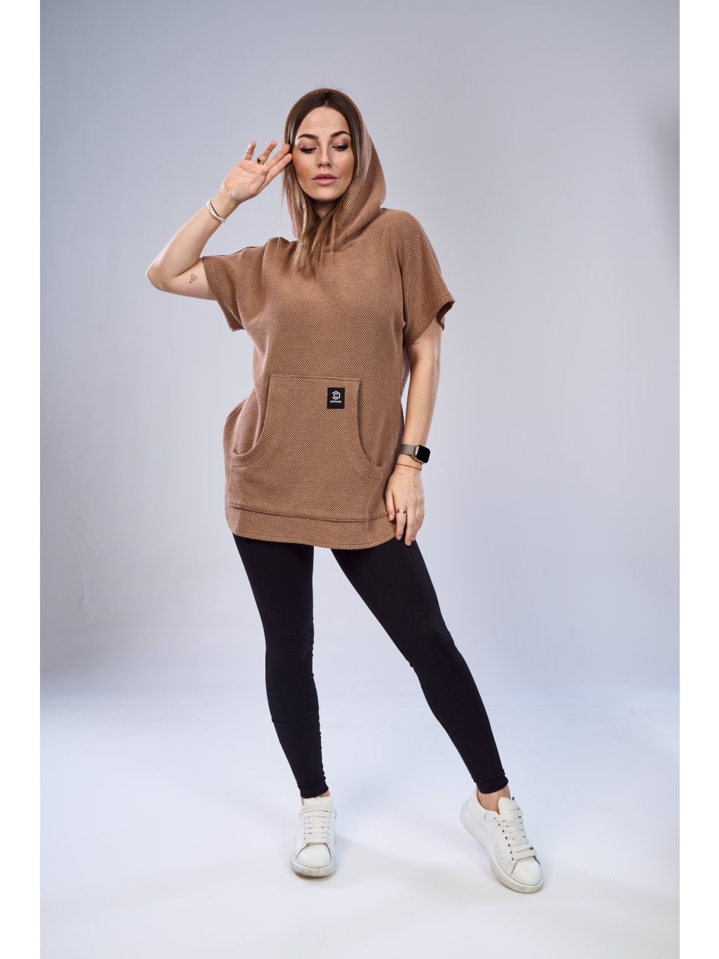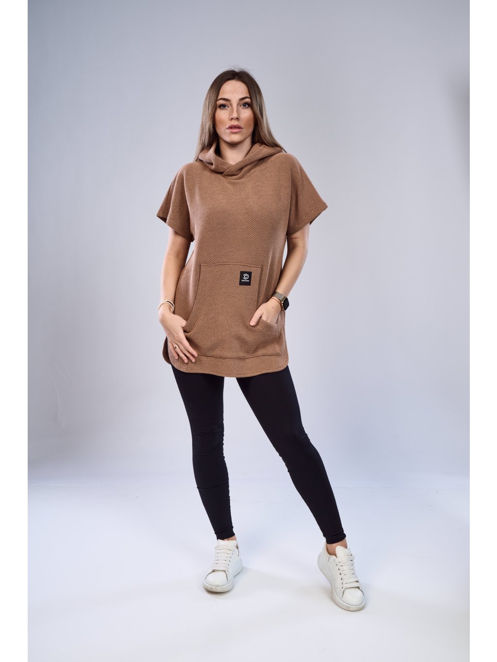 Stylová a pohodlná dámská vesta volnějšího střihu s krátkým rukávem a kapucí je ideální pro každodenní nošení. Vyrobena z příjemného, měkkého materiálu, který zaručí maximální komfort po celý den. Praktická klokaní kapsa na přední straně dodává vestě ležérní vzhled a zároveň poskytuje prostor pro drobnosti.
