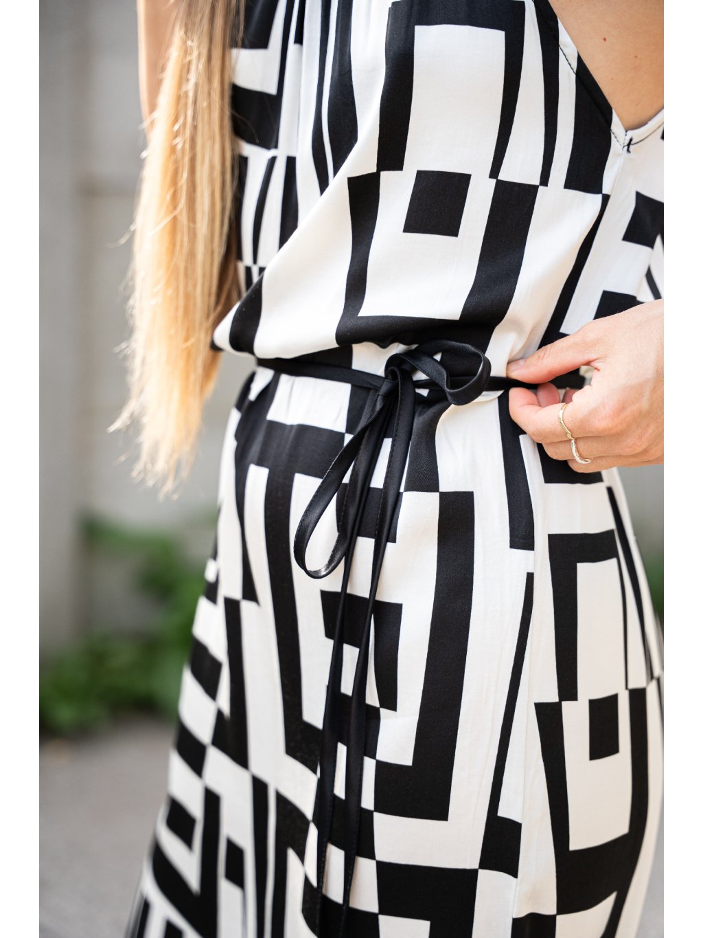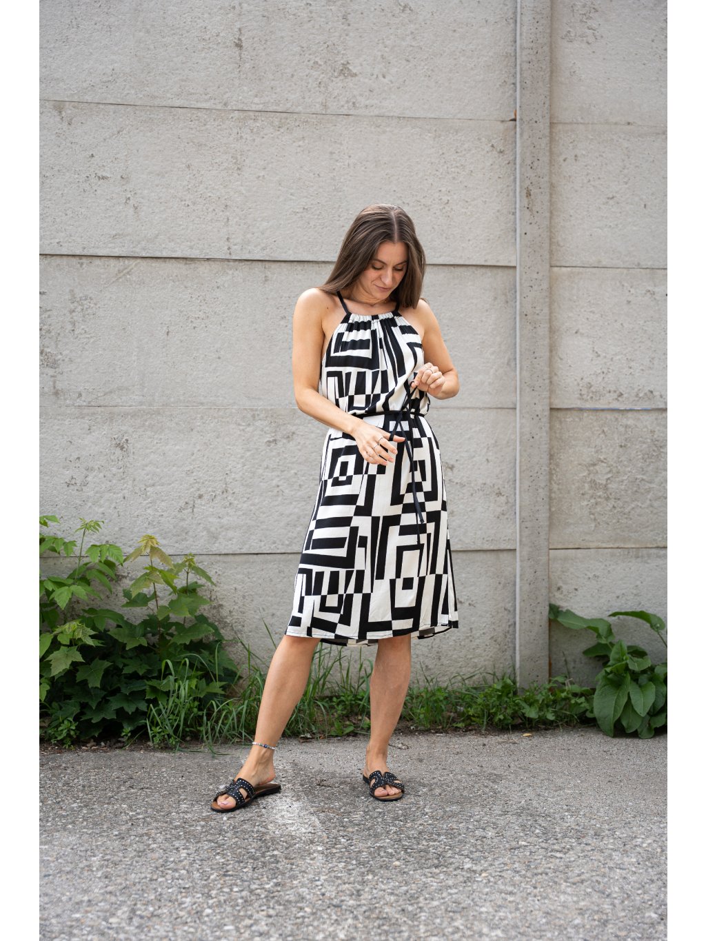 Letní šaty, které udělají efekt bez námahy. Černo-bílý geometrický vzor působí moderně a krásně vynikne na slunci. Lehký, splývavý střih je pohodlný i v horkých dnech a vázačka v pase si upraví siluetu přesně podle sebe. Detail, který baví: ramínka na zavazování s mašličkami a jemné řasení u výstřihu pro ženský look.
