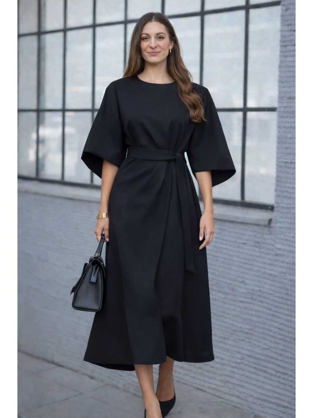 Šaty CONTRACOR Aurora Black jsou ztělesněním minimalistického luxusu. Čisté linie, splývavý střih a sofistikované kimono rukávy vytvářejí siluetu, která lichotí postavě a působí sebevědomě a ženským dojmem. Jemné řasení a zavazování v pase umožňuje přizpůsobení podle vaší postavy, zatímco midi délka dodává šatům univerzální využití – od pracovních schůzek po večerní události.